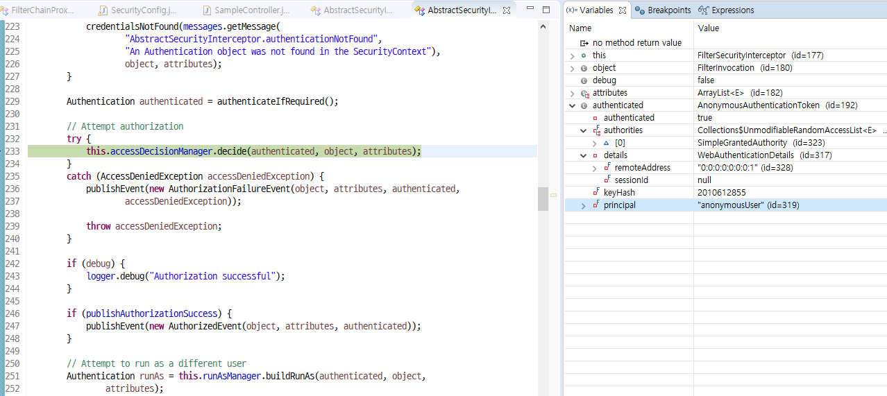 - 해당 Authentication이 특정한 Object에 접근할 때 필요한 ConfigAttributes를 만족하는지 확인한다. ( code 에 설정한 role 확인 )