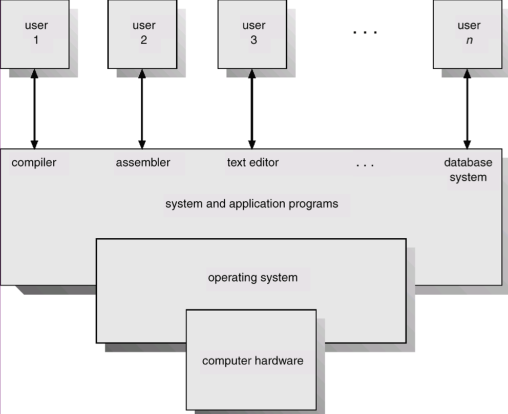 - Kernel – 항상 실행되고 있는 유일한 프로그램 (= 커널) 그 외의 것은 모두 application programs이다.