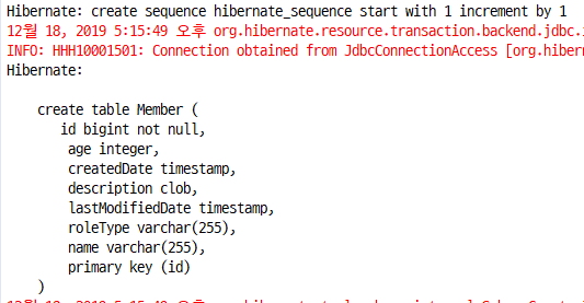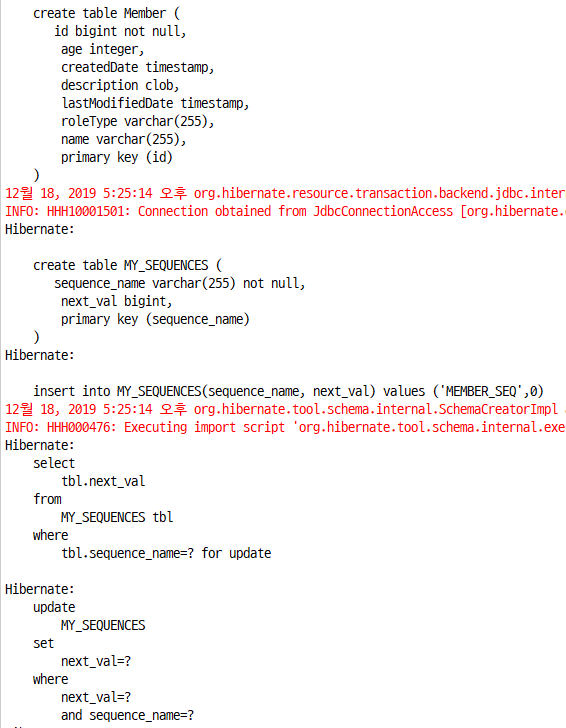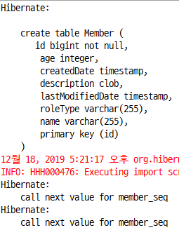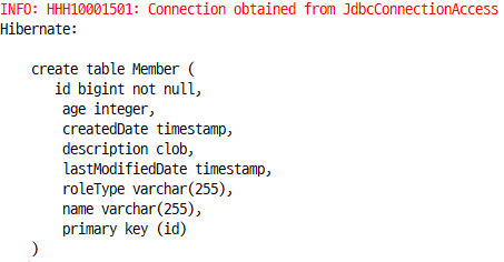 - create-drop: create와 같으나 종료시점에 테이블 DROP (DROP + CREATE..UPDATE... + DROP)