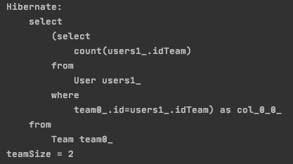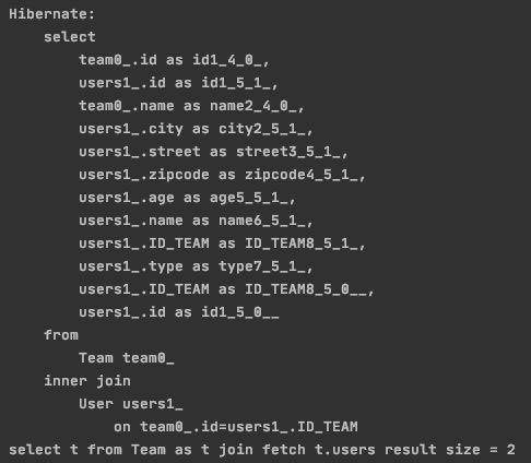 System.out.println("\"" + fetchJoinQuery + "\" result size = " + teams.size());