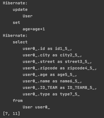 - executeUpdate() 의 결과는 영향받은 엔티티 수 반환한다.