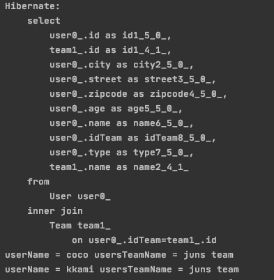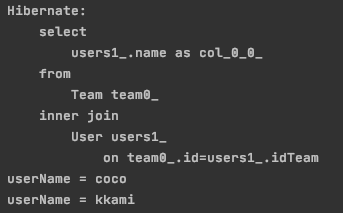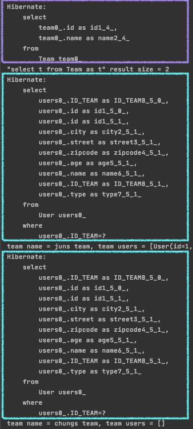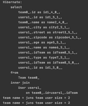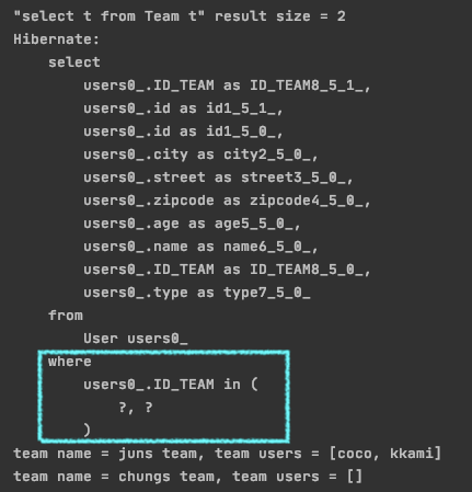 teams.stream().forEach(t -> System.out.println("team name = " + t.getName() + ", team users = " + t.getUsers().toString())); // user에 대한 select query 발생하지 않음
