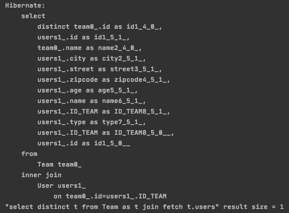 System.out.println("\"" + distinctFetchJoinQuery + "\" result size = " + teams.size());