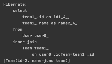 Team resultTeam = entityManager.createQuery("select u.team from User as u", Team.class).getSingleResult();