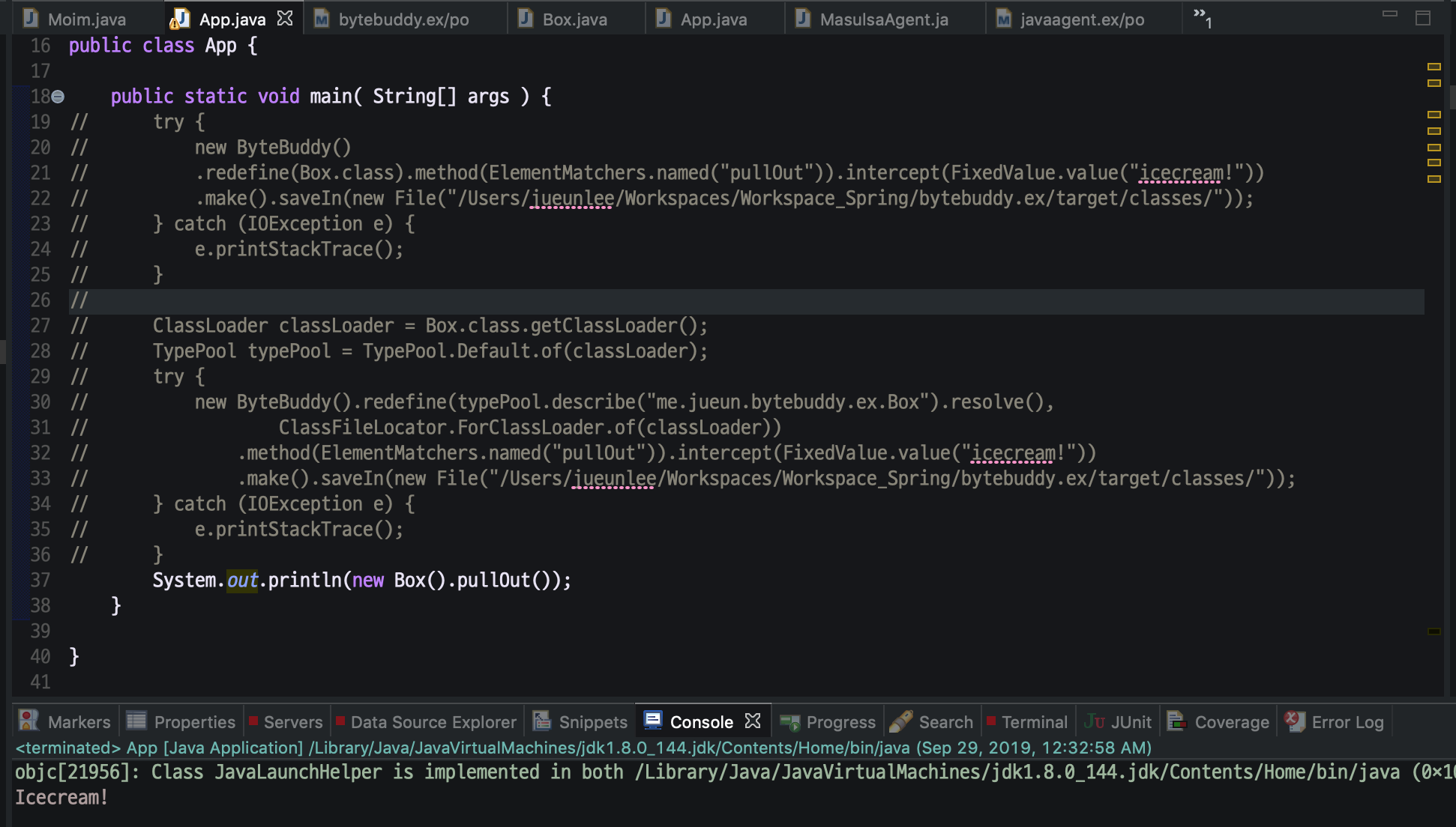 Box의 java 소스는 그대로이나, claas 파일의 바이트 코드를 변경시킴. Box 인스턴스 생성 시에는 이미 컴파일된 클래스 파일을 참조하므로, 변경된 바이트 코드가 실행됨. 그 결과 Icecream 🍦이 나온다!!