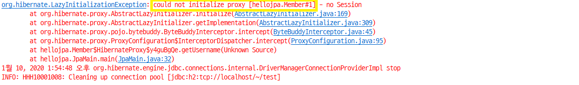 위의 실행 결과에서 볼 수 있듯이, 영속성 컨텍스트의 도움을 받을 수 없는 준영속 상태일 때, getter 메소드를 호출하면 하이버네이트는 org.hibernate.LazyInitializationException 예외를 터트린다.