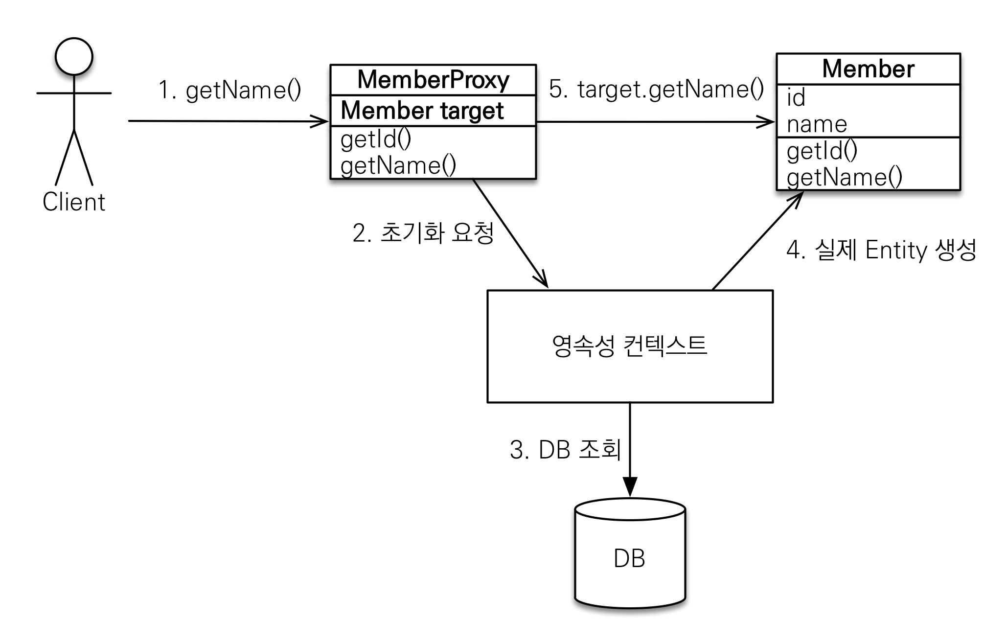 - JPA는 이 상황에서 영속성 컨텍스트에 진짜 member 객체를 요청한다. ( 영속성 컨텍스트를 통해서 초기화를 요청함 )