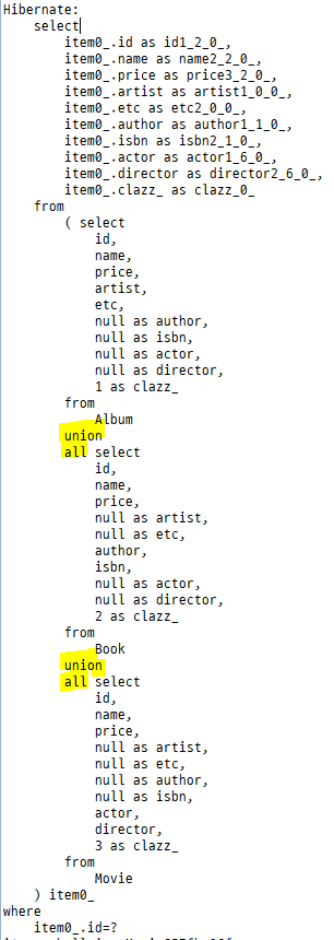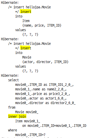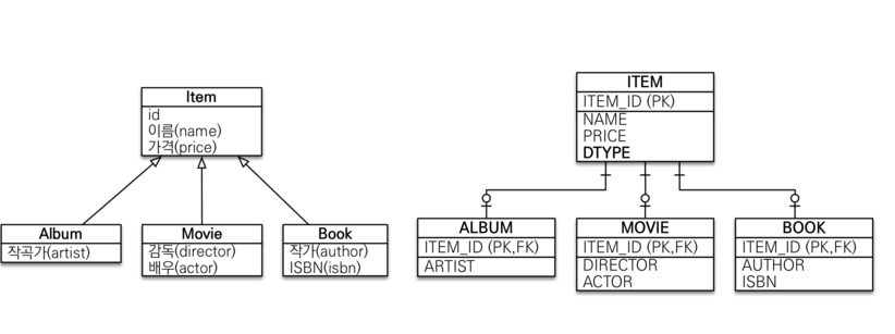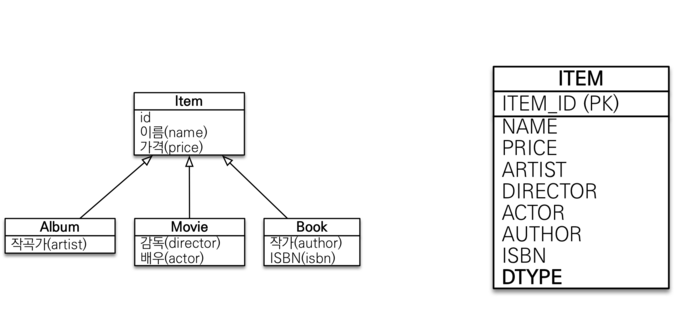 데이터를 조회할 때, PK, FK로 조인하여 가져온다. (DTYPE을 보고 어떤 테이블에 존재하는지 알 수 있다.)