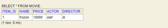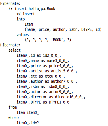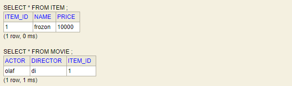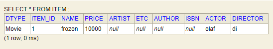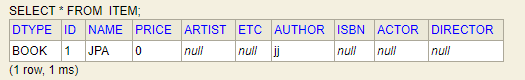 데이터를 생성할 때, 공통적인 속성(NAME, PRICE, DTYPE)은 ITEM 테이블에 INSERT, 서브 테이블의 속성은 서브 테이블에 INSERT