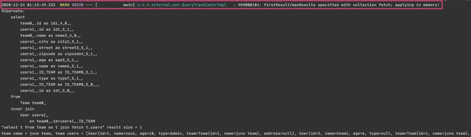 아래 실행 결과를 보면, 하이버네이트가 firstResult/maxResults specified with collection fetch; applying in memory! 경고를 발생시키며, 실제 쿼리에서는 limit/offset 설정 없이 쿼리가 나간 것을 확인할 수 있다.